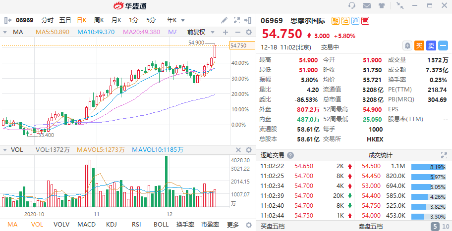 华盛资讯12月18日讯,思摩尔国际(06969)盘中大涨,股价再创历史新高。截至发稿,思摩尔涨5.8%,现报54.75港元,成交量达1372万股,成交额7.375亿港元,当前总市值为3208亿港元。