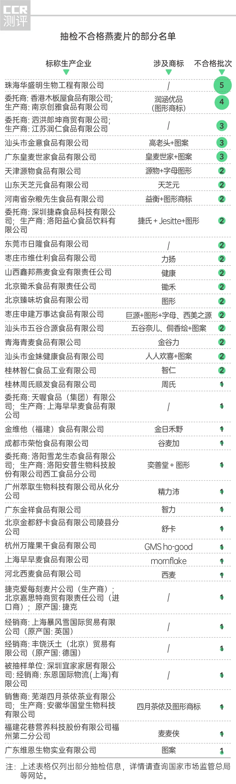此外,消费者较熟悉的品牌如“西麦”“智力”“天喔”“宜家”“金日禾野”“精力沛”等也曾抽检不合格。