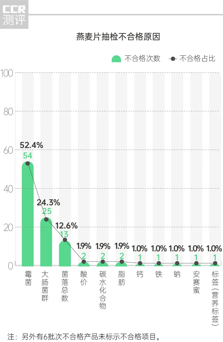 结果显示,近5年,监管部门共抽检发现不合格燕麦片93批次,不合格原因主要是微生物污染,其中以霉菌超标所占比例最高,其次是大肠菌群和菌落总数。