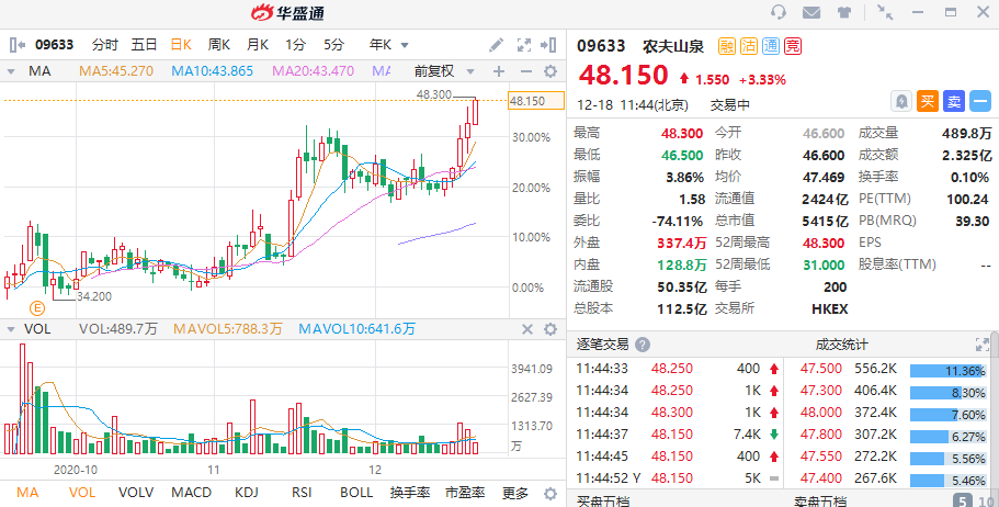 华盛证券12月18日讯,农夫山泉(09633)近日来持续上涨,股价再破历史高点。截至发稿,农夫山泉涨3.33%,现报48.15港元每股,当前成交额达2.325亿港元,总市值为5415亿港元。一周累计涨幅超15%,上市以来已累计涨近50%。