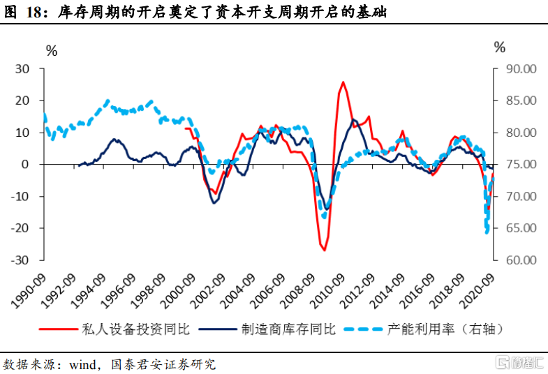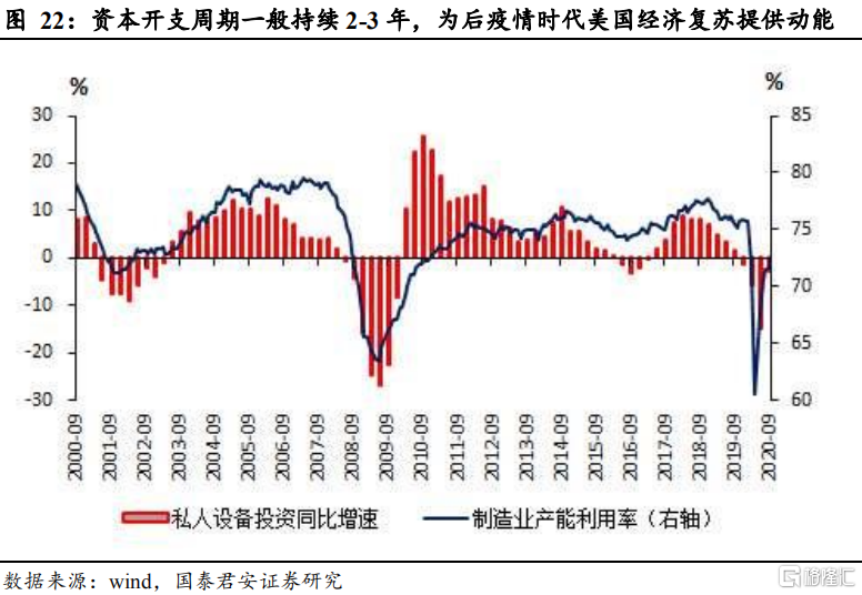 综合当前美国企业资本开支的条件、能力和意愿,我们认为后疫情时代美国的资本开支周期将启动,进一步推动美国经济在2021年的复苏进程。从资本开支周期的持续时间看,一般都要持续2-3年,能够很好地接力补库周期,给后疫情时代的经济恢复提供动能。