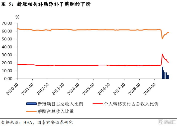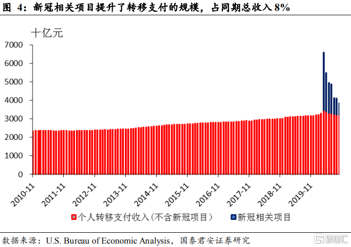 2)2020年,美国补贴对其居民收入贡献约8个百分点。新一轮财政刺激或贡献收入3个百分点,实物消费或超3个百分点。