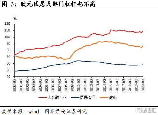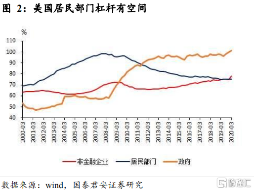 欧美发达经济体的财政在疫情期间“积极作为”,政府部门杠杆率提升,但居民杠杆率依旧维持低位。从资产负债表的分析框架出发,考察欧美发达经济体三部门的资产负债表情况。截至2020年6月底,根据国际清算银行(BIS)统计的数据,较2019年年底,欧元区政府部门杠杆率提升了11个百分点达到95%,居民部门杠杆率仅提升2个百分点达到60%。美国政府部门杠杆率提升了17个百分点达到117%,居民部门仅提升1个百分点76%。欧美居民部门杠杆率水平仍处于较低水平,2008年金融危机后居民资产负债表得到了较大的修复。这为后续居民部门的消费奠定了基础。