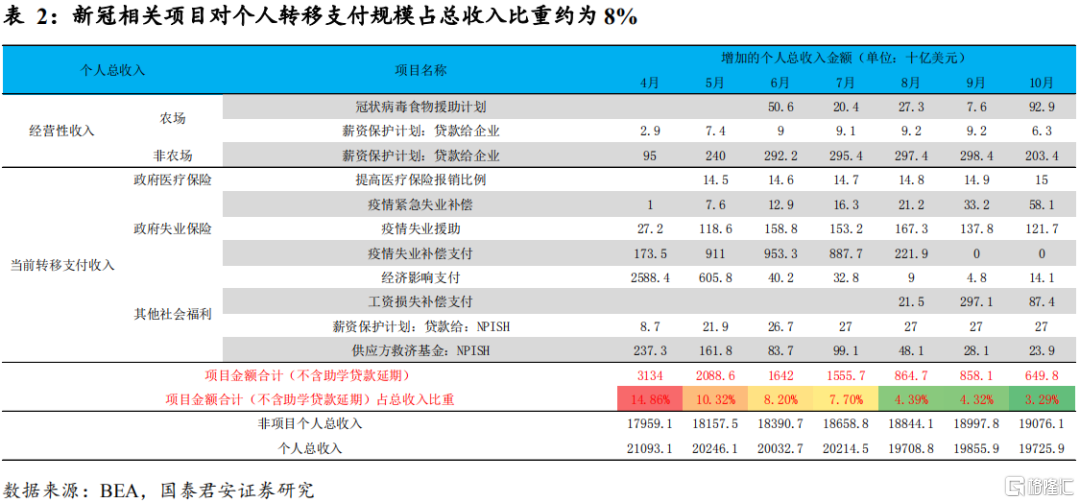 面对疫情冲击,欧美都开启了大规模的财政刺激方案,对冲了薪酬收入的下滑。就美国而言,新冠相关的财政补贴对个人的总体收入贡献约为8个百分点,基本弥补了薪酬收入下降带来的收入冲击。新冠相关的财政补贴对个人收入的贡献体现在转移支付项目中。美国个人转移支付在新冠疫情前维持在3.2万亿美元(折年数)左右的水平。2020年4月份随着补贴的开始,整体的转移支付规模快速跃升到6.6万亿美元(折年数)的水平。根据美国经济分析局公布的美国个人收支的数据,4-9月份合计增加转移支付10万亿美元(折年数),月均为1.7万亿,占同期美国个人总收入的比例为8%,在补贴的支撑下美国个人收入在疫情期间实现了正增长,4月同比增长14%,随后随着补贴的下滑而有所回落,截至10月仍同比增长6%。
