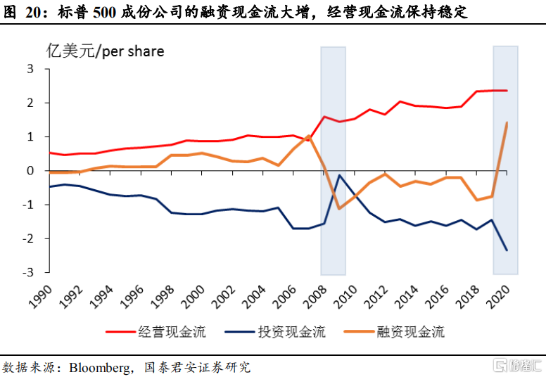 上市公司的财务报表状况也保持良好,融资现金流飙升。标普500的财务数据统计,成份公司的融资现金流规模大幅度提升,从2019年末的-0.7亿美元每股快速提升到了1.42亿美元每股。同时经营现金流保持稳定。而且,从投资现金流观察,投资的规模已经有所扩大。