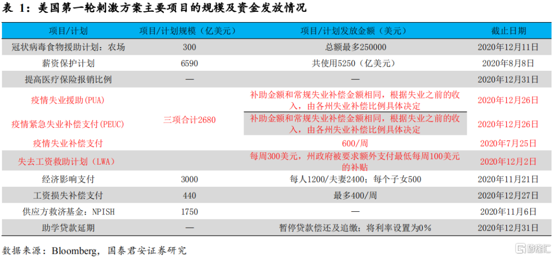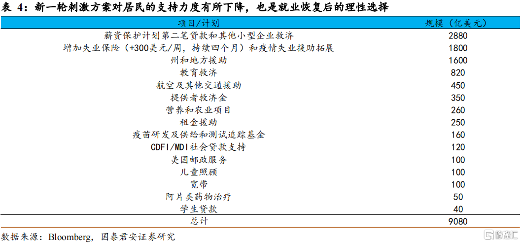 第一轮财政刺激对美国经济各主体力争进行全方位帮扶,居民补助力度尤大。美国的第一轮刺激方案名目繁多,有针对企业、农场以及州政府等各主要部门,其中对居民部门的救助力度尤大。每人发放1200美元,每个孩子发放500美元,此外疫情失业补偿支付计划每个人每周支付600美元,在7月26日到期后,特朗普又签署了Lost Wages Assistance program计划,从9月21日联邦政府支付300美元每周,州支付100美元,为期6周。对居民的补助增加了居民的收入,如前文所述,居民的整体收入反而上升。落实到居民收入端,新冠相关的转移支付贡献居民收入1.5万亿(折年数),占总收入的比例约为8%。
