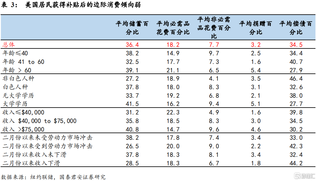第一轮刺激的资金规模较大,居民并没有完全消费,积累了大量储蓄。根据纽约联储发布的一份调查研究报告,研究者利用消费预期调查问卷(New York Fed Survey of ConsumerExpectations -SCE)得到信息显示,美国居民在得到财政补贴后其边际消费倾向或仅为29%,而且这其中还包括了用于捐赠的3.2个百分点的补贴。根据调查,居民在得到补贴后,大部分的资金被用于储蓄,该比例约占36%,据此推算存下的资金规模或达到5000亿美元(折年数)。该调查还提供了学历、收入分层的调查结果。而且,针对如果有下一轮补贴的假设性问题的调查结果显示,居民的边际消费倾向或进一步下降,或仅为24%。