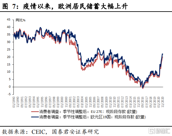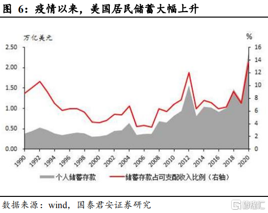 海外复苏三重奏之需求:政府“积极有为”,居民部门存款大幅上升,消费动能持续性强。