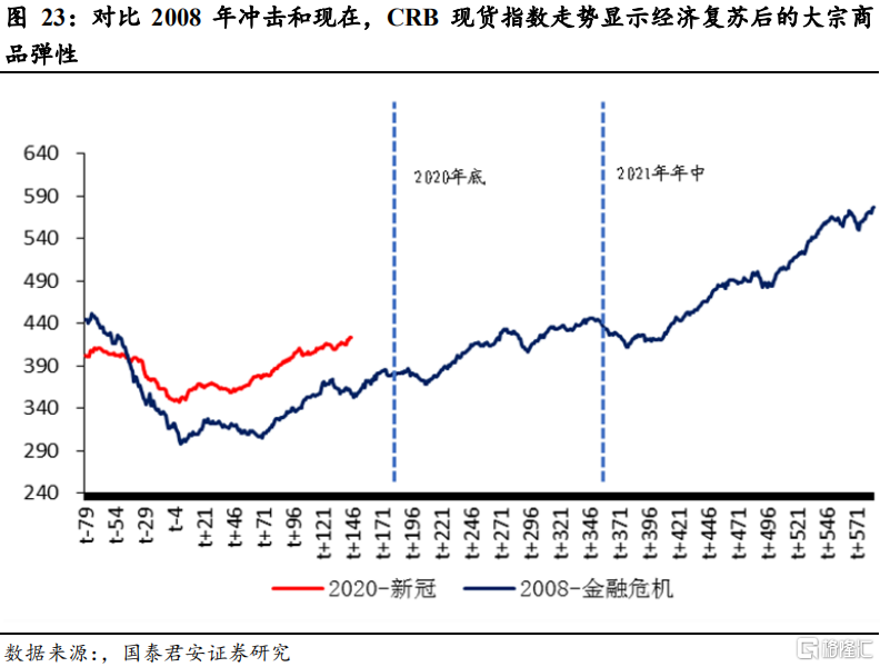 全球生产逐步恢复,补库的需求将带来生产的大幅度提升,资源品需求加大。对比2008年金融危机后的资源品的表现,大宗商品受到冲击后的走势基本趋同,随着经济的恢复,大宗商品上涨的态势较为明确。