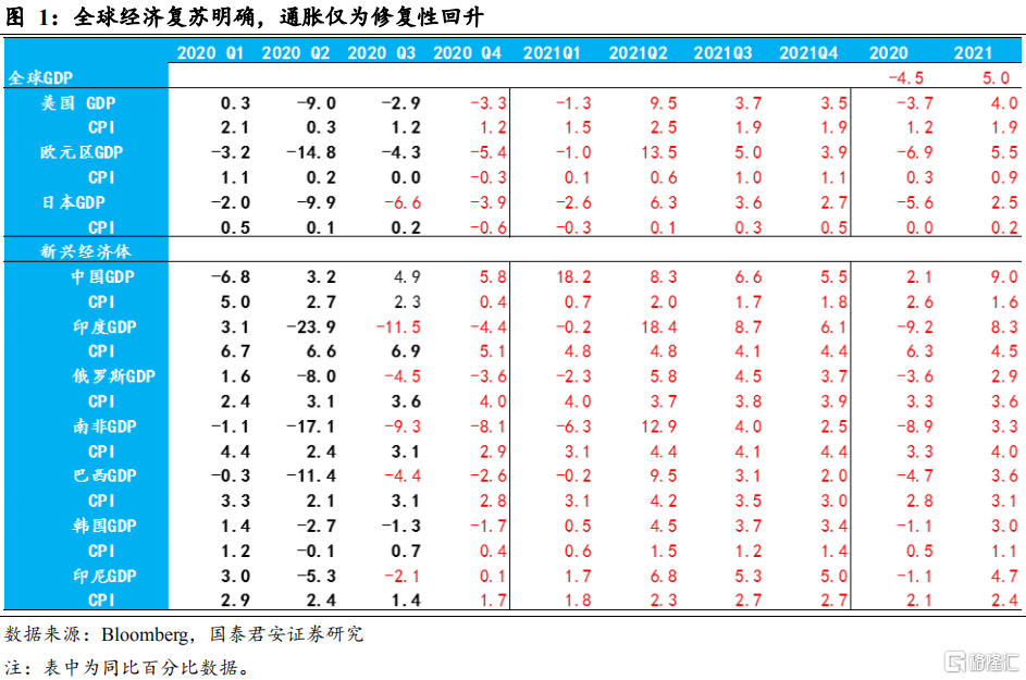 通胀将随着经济的复苏而回归,但不会构成通胀风险。我们认为2021年虽然发达经济体的货币政策仍然保持宽松,但是财政政策将普遍进行回撤,根据IMF的预测主要经济体的失业率在2025年回到充分就业水平,因此工资属于恢复性增长。另外,全球一体化的生产,如2020年中国的生产弥补全球的供给不足,都会抑制通胀。