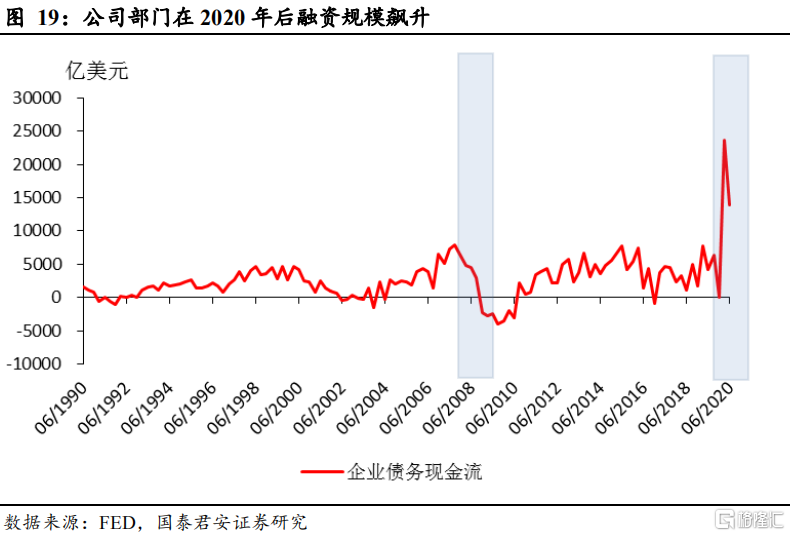疫情后宽松的融资环境给了企业资本开支的能力。不同于2008年的金融危机,本次疫情冲击后经济处于被动停滞,同时财政部和美联储联合推出了系列支持企业的信贷措施。因此,我们看到当前美国公司的贷款规模没有出现类似2008年的下降,反而出现了大幅度的飙升。根据美联储公布的各部门的资金流量表,公司的融资规模在2020年第一、二季度分别达到了2.4万亿和1.4万亿,远远高于2019年不足万亿的水平。更不同于2008年危机后,金融体系受损,融资规模下降的情况。