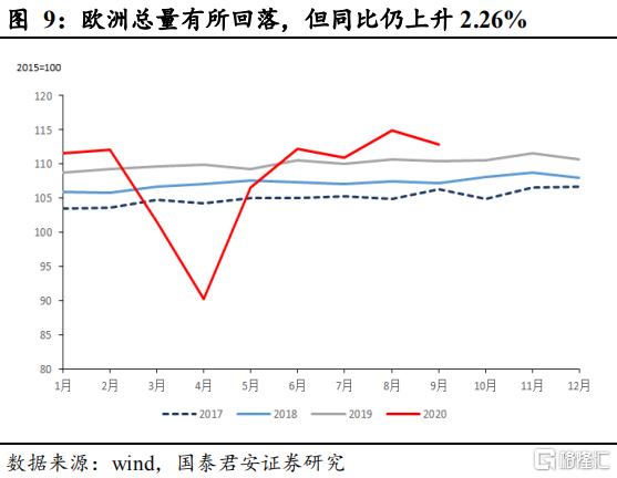 由于收入稳定,欧美的实物消费均保持强劲。10月美国零售和食品服务销售额较9月继续回升,同比增长6.01%,消费恢复情况较好。欧洲商品零售近期虽有回落,但依旧保持正增长,消费需求仍然不弱。