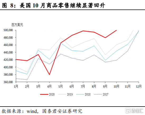 当前讨论的新一轮刺激方案,对居民救助力度远小于第一轮,这也是就业恢复后的理性选择,或可贡献3个点的实物消费规模。根据近期两党讨论的9080亿美元的计划,其中对失业保险要增加300美元/每周,持续四个月,总体的救助规模为1800亿美元。这一方案远小远之前的总规模金6000亿元的刺激方案,发放的金额也有所下降,但是与7月后的600美元到期后的最高275美元的补助基本相当。因此,我们认为考虑到就业的恢复、留存的储蓄以及新一轮刺激方案的补助金额的连续性,美国的消费仍将保持稳定。根据10月个人收入中新冠相关项目的转移支付金额的规模约为6500亿美元,假设新一轮刺激后可以维持这个规模,按照纽约联储的调查的边际消费倾向24%,对应支出约1560亿美元,则贡献非服务消费支出(10月耐用品和非耐用品支出合计49240亿美元)规模约3个百分点。我们认为这一估计将低估对消费的带动作用,随着疫情的缓解,经济环境的明朗,居民的消费意愿有望继续提升,特别是对服务性消费。