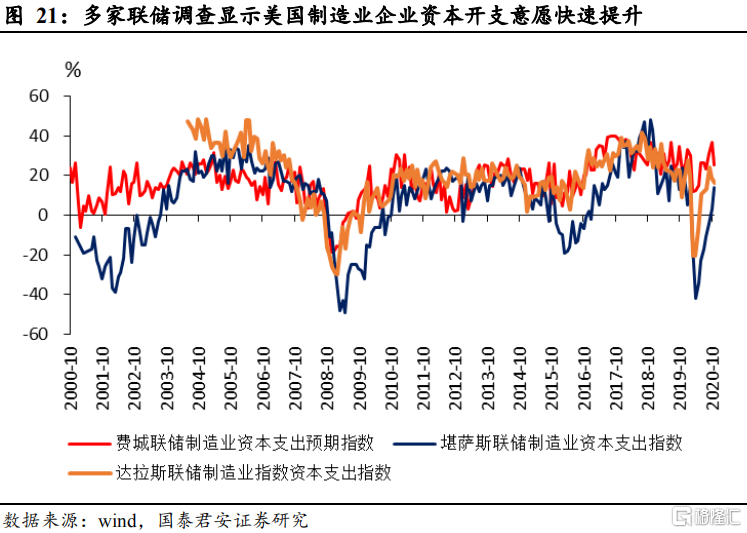 而从联储的调查看,企业资本支出的意愿也较强。费城、堪萨斯、达拉斯联储的调查数据均显示,制造业企业的资本开支意愿快速回升,已经接近前轮高点水平。