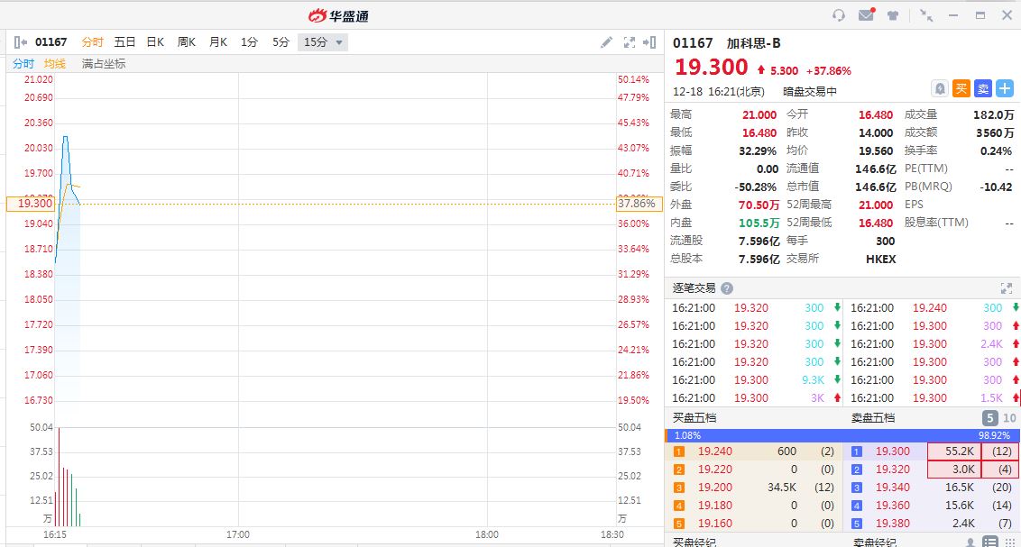 加科思-B(01167)今日16:15-18:30期间进行暗盘交易,目前加科思-B涨37.86%,不计手续费,一手盈利1590港元。预期股份将于2020年12月21日上市。