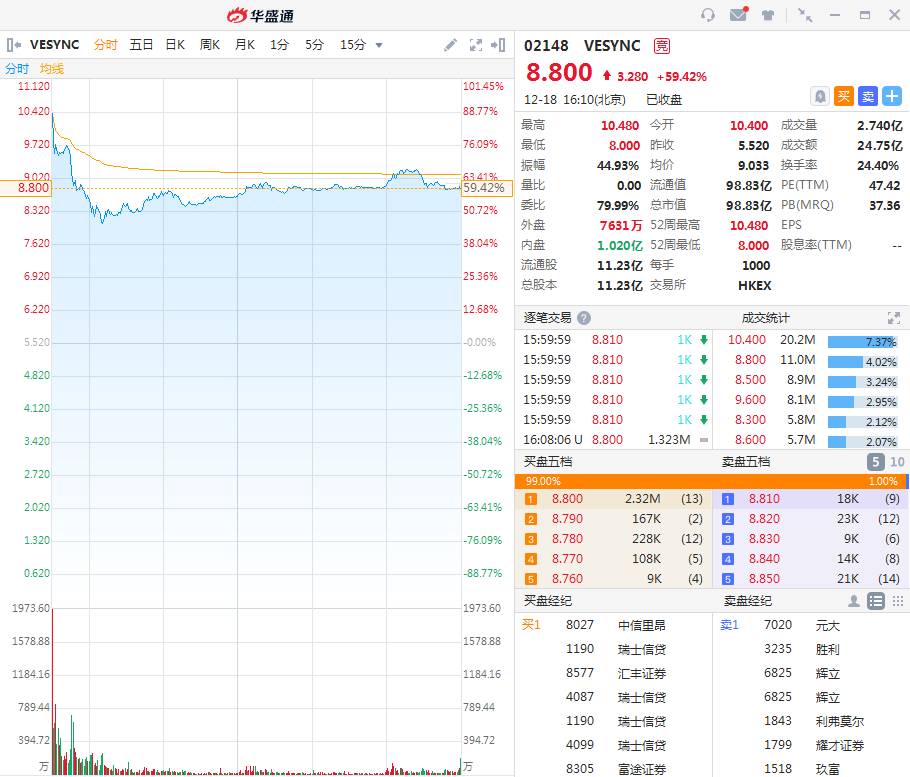 华盛资讯12月18日讯,VESYNC(02148.HK)收涨59.42%,报价8.80港元,全日最高价10.48港元,最低价8.0港元,最新总市值98.83亿港元,成交额24.75亿港元,一手账面盈利3280港元。