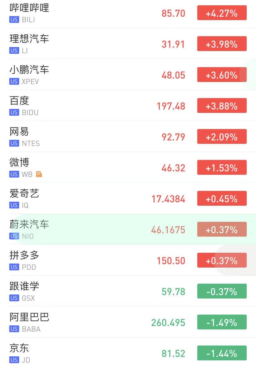 截至发稿,哔哩哔哩大涨4.27%,理想汽车大涨3.98%,小鹏汽车涨3.60%,百度大涨3.88%,网易涨2.09%。阿里巴巴跌1.49%,拼多多跌1.44%。