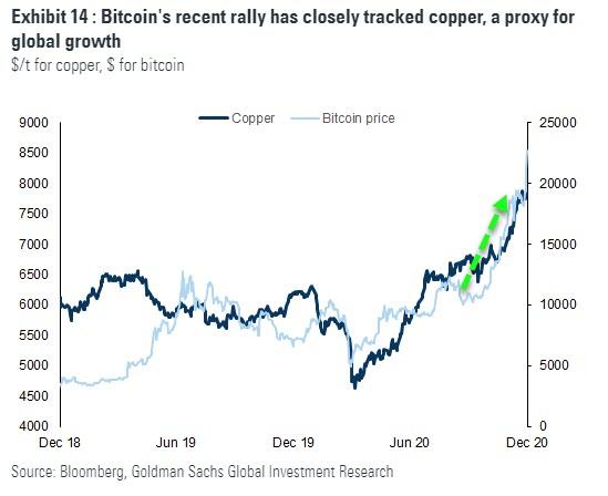 高盛的杰夫·库里(Jeff Currie)写道,黄金相对于实际利率和美元的近期表现不佳,这让一些投资者担心比特币正在取代黄金,成为对冲通胀的首选。虽然有一些替代品正在出现,但他并不认为比特币日益流行会对黄金作为最后货币的地位构成生存威胁。机构投资者和富有的个人由于其固有的透明度问题而避免加密货币,而投机的零售投资导致比特币成为一种过度风险资产。事实上,自第一次疫情导致封锁以来,比特币的涨幅一直与铜的涨幅密切相关,铜是全球经济增长的关键指标。