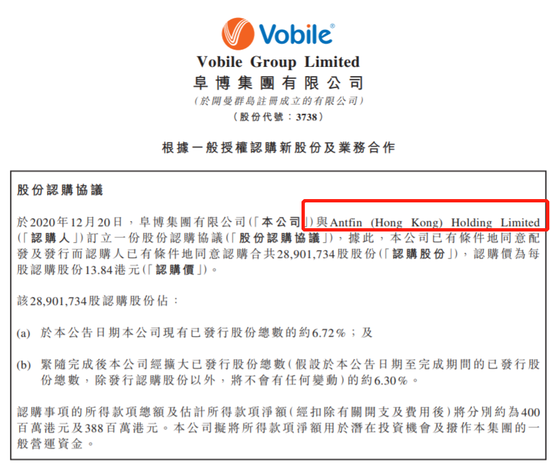 12月21日消息,阜博集团(03738)公布,公司折让7.49%配发2890.2万股予Antfin(Hong Kong)Holding Limited,认购价为每股认购股份13.84港元。
