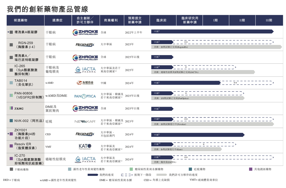 目前,兆科眼科已建立起包含23种候选药物的眼科药物管线,包括11种创新药物和12种仿制药,涵盖影响眼前节及眼后节的多数主要眼科疾病及症状。根据灼识咨询的资料,兆科眼科拥有中国最全面的眼科药物管线之一。