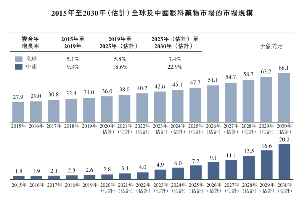 2015年至2019年,中国眼科药物的市场规模以9.3%的复合年增长率从18亿美元增至26亿美元,并预计以18.6%的复合年增长率在2025年增至72亿美元,而2025年至2030年的复合年增长率将进一步提升至22.9%,远超同期全球眼科药物市场的增速。