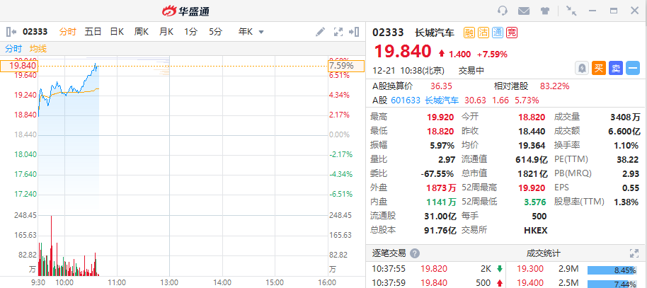 华盛资讯12月21日讯,长城汽车(02333)盘中异动,最高见19.92港元,再创历史新高,现报19.84港元,涨幅7.59%,成交额达6.6亿港元,最新总市值1821亿港元。