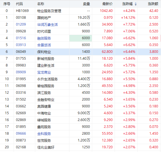 华盛资讯12月21日讯,物业管理股今日涨幅扩大,截至发稿,国锐地产涨超14%,领涨板块;华润万象生活涨7.72%,时代邻里涨7.06%,融创服务、合景悠活、保利物业涨超6%,新城悦服务、建业新生活、宝龙商业、永生生活服务等涨超5%;碧桂园服务、滨江服务等涨超4%。其他物管股金科服务、世贸服务等皆有上涨。