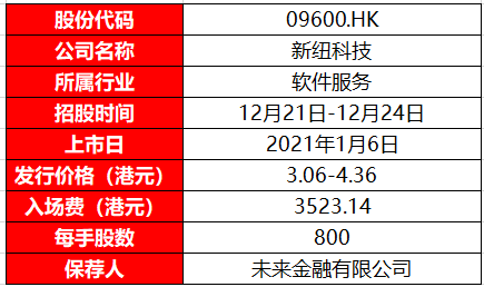 根据港交所最新公告,新纽科技(09600)今起招股,拟发行2亿股,其中,香港公开发售占10%,国际发售占90%,另有超额配股权15%。招股价介于3.06-4.36港元,每手800股,入场费约3523港元。股份预计将于1月6日挂牌上市。未来金融为独家保荐人。