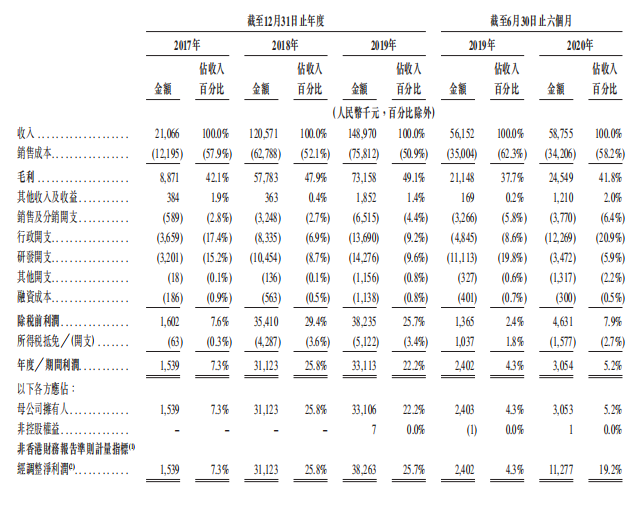 公司的收入来自为金融机构、医疗机构及其他企业提供软件开发服务、技术及维护服务以及软件销售。新纽科技2017财年至2019财年总营收分别为人民币2106.6万元、1.21亿元及1.49亿元,复合年增长率为165.9%;同期录得净利润153.9万元、3112.3万元及3311.3万元,复合年增长率为363.9%。2020年上半年,公司录得总营收5875.5万元,同比增长4.6%,净利润305.4万元,同比增长27.1%。