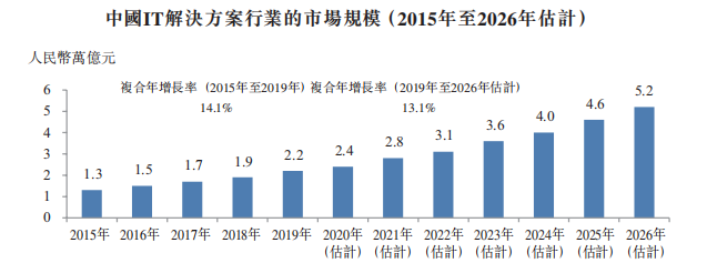 IT解决方案乃作为组合软件包为金融行业、能源行业、医疗行业、农业、教育行业、娱乐行业及其他行业等主要领域提供的一组相关软件程序及服务。中国的IT解决方案行业于过往五年发展迅速。具体而言,按收入计,中国IT解决方案行业的市场规模自2015年的人民币1 .3万亿元增至2019年的人民币2 .2万亿元,复合年增长率为14 .1%。随着经济增长转为侧重于服务业及中国产业升级,IT解决方案行业于2019年至2026年预计将以13 .1%的可持续复合年增长率进一步发展,至2026年市场规模将达人民币5 .2万亿元。于2019年,中国有逾5000名市场参与者从事IT解决方案行业。