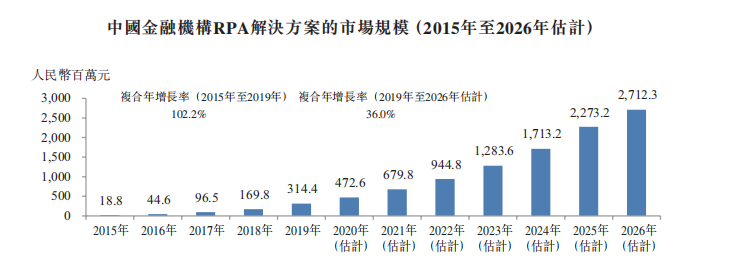 凭借先进的技术及有效节省成本的卓越能力,金融机构RPA解决方案的利润率通常高于传统型金融机构IT解决方案的利润率。 RPA解决方案通过以机器人执行实现流程自动化来取代劳动密集型程序,帮助优化金融机构的运营效率,进而降低劳工成本。 RPA解决方案是AI技术的一项重要应用。因此,中国的RPA解决方案市场持续受益于旨在促进AI行业发展的有利政府政策。该等政策包括国务院关于印发新一代人工智能发展规划的通知、科技部关于印发《国家新一代人工智能开放创新平台建设工作指引》的通知及科技部关于印发《国家新一代人工智能创新发展试验区建设工作指引》的通知。按收入计,中国金融机构RPA解决方案的市场规模自2015年的人民币18 .8百万元增加至2019年的人民币314 .4百万元,复合年增长率为102 .2%,预计于2026年将达人民币2,712 .3百万元,2019年至2026年的复合年增长率为36 .0%。