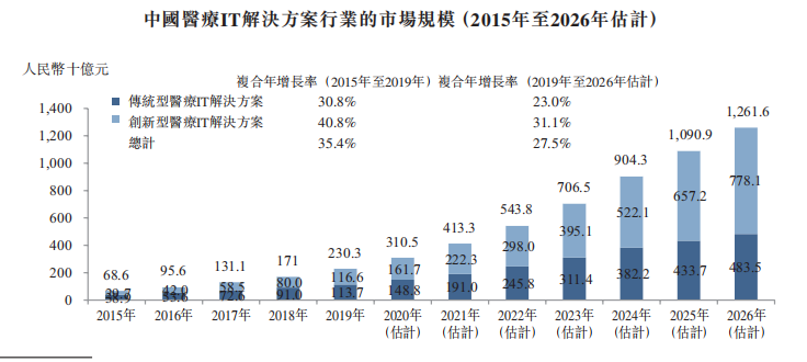 得益于中国于改善医疗质量及解决医疗资源分布不均方面有利的政府政策(如《电子病历应用等级评价标准管理办法(试行)》),按收入计,中国医疗IT解决方案行业的市场规模自2015年的人民币686亿元(占同年IT解决方案行业市场规模的5 .3%)增至2019年的人民币2,303亿元(占同年IT解决方案行业市场规模的10 .6%),复合年增长率为35 .4%。该市场预计将于2026年增至人民币12,616亿元(占同年IT解决方案行业市场规模的24 .3%),2019年至2026年的复合年增长率为27 .5%。
