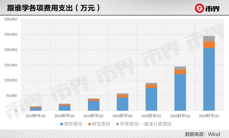 直到第三季度,跟谁学净亏9.325亿元,首次出现季度亏损。其中,公司销售费用猛增至20.56亿元,而在此之前,公司在销售上的支出一向“谨慎”,2020财年一、二季度分别为7.57亿元、12.05亿元,整个2019财年合计也不过10多亿元。
