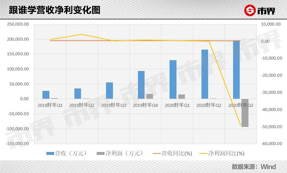 而2019年初到2020财年第三季度之前,跟谁学共计实现盈利3.93亿元,也就是说,仅今年第三季度的亏损,跟谁学就亏掉了过往利润之和的2.37倍。