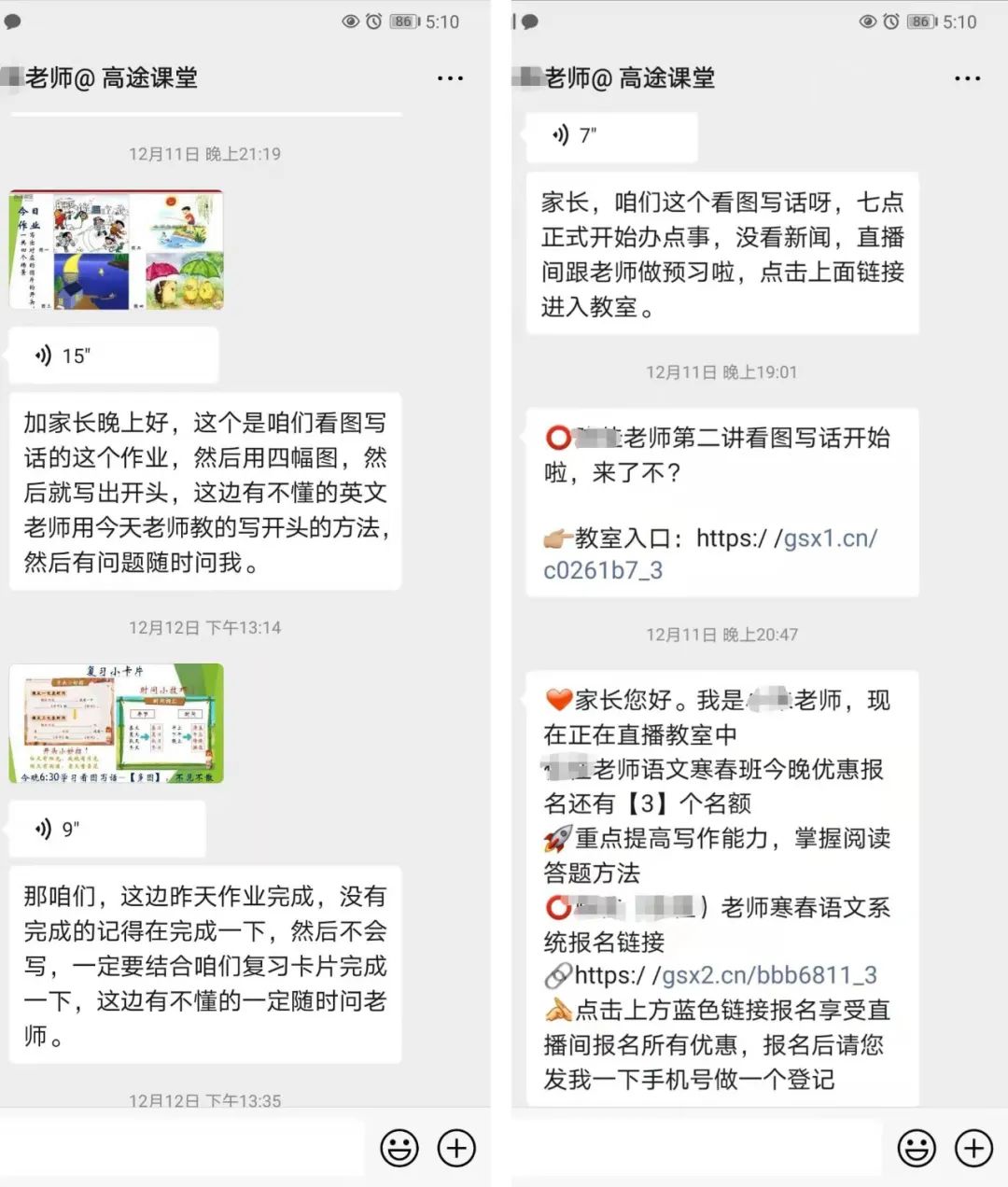 市界参与了一次整个流程,不同年级层、报名不同科目的家长会通过扫码进入到不同的微信群当中,群主则是负责该年级、该科目的辅导老师,并要求用户加其个人微信,然后将试听课的直播链接发给用户。