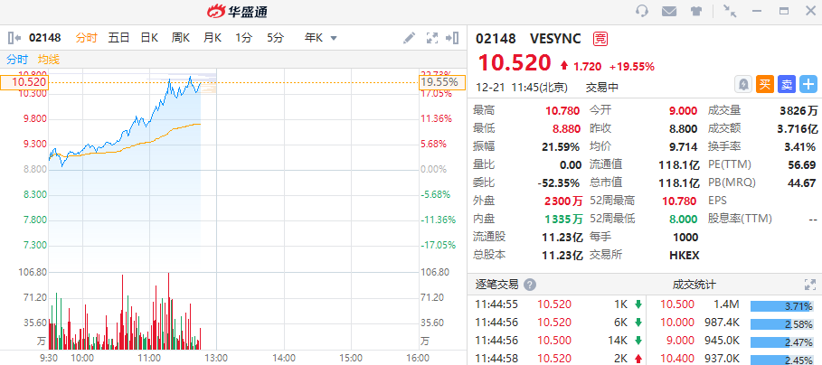 华盛资讯12月21日讯,小家电次新股VESYNC(02148)今日持续上涨,盘中一度拉升超20%,突破历史高点。截至发稿,VESYNC涨19.55%,报10.52港元,成交额3.716亿港元,当前总市值达118.1亿港元。较发行价5.52港元上涨逾90%。