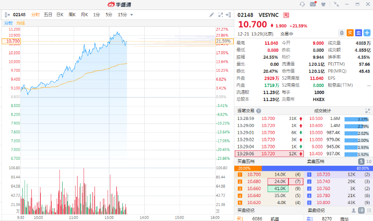 12月21日消息,美国小家电零售商Vesync午后涨幅扩大至21.59%,报10.7港元,市值120亿港元。此前一度涨25%。
