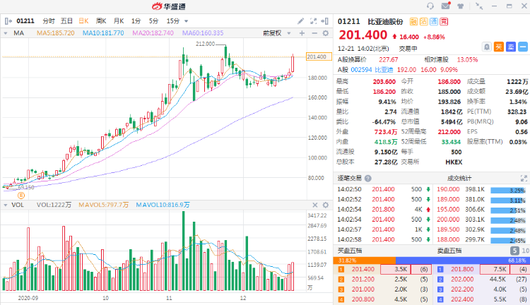 比亚迪股份(01211)午后涨幅扩大,AH股均涨逾8%。截至发稿,H股涨8.86%,报201.4港元,成交额23.69亿港元。