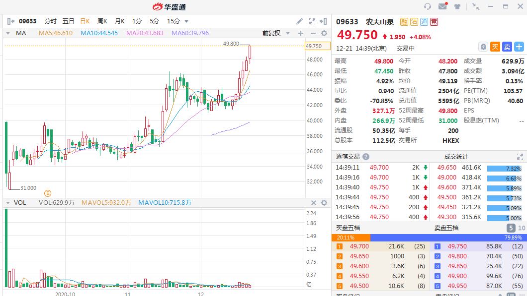华盛资讯12月21日讯,农夫山泉(09633)盘中异动,目前涨超4%,刷新历史新高,此股已连续六日上涨。截至发稿,农夫山泉上涨4.08%,现报49.75港元,成交额3.094亿港元,总市值达5595亿港元。