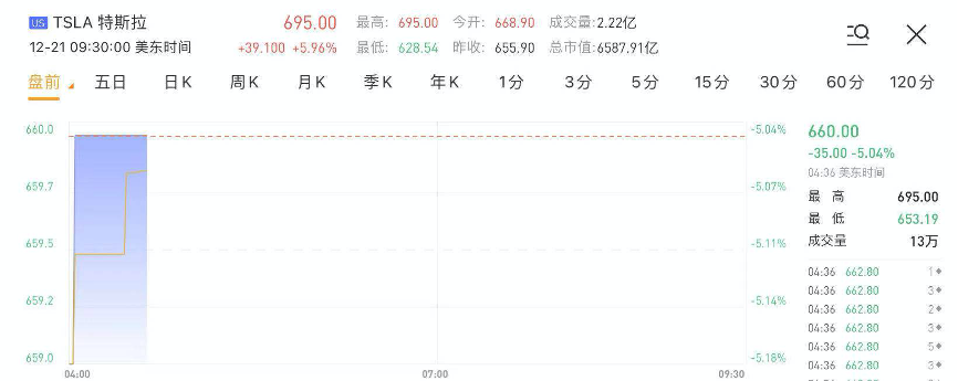 华盛资讯12月21日讯,特斯拉盘前大跌超5%。截至发稿,特斯拉跌5.04%,今日将正式纳入标普500指数。