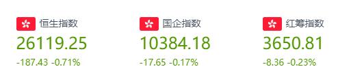 港股市场早盘升高后跳水,尾盘有所拉升,截至收盘,恒生指数跌0.71%,报26119.25点,恒生国企指数微跌0.17%,报10384.18点。恒生科技指数收红,报8186.66点,涨0.33%。大市成交1237.26亿元。南下资金净流入6.86亿元。