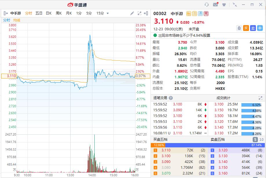 此前有消息称字节跳动正在就收购手机游戏发行商中手游进行谈判,字节跳动希望以4-5港元/股的价格收购该公司部分股份。对此,字节跳动方面表示:不属实。中手游亦发布公告称此次传言不属实。受传闻影响,港股中手游盘中直线拉升一度暴涨超20%,但否认后,中手游涨幅快速回落,最后仅收涨0.97%。