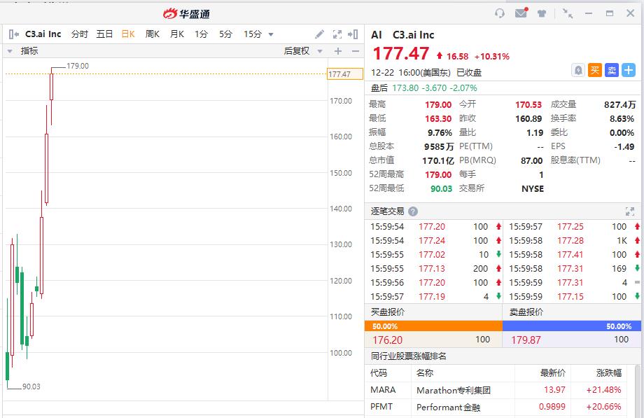 周二美股C3.ai继续上涨,截至收盘,该股涨10.31%。该股自今年上市至今已涨超300%。C3.ai的业务模式是企业级的PaaS。它可以快速部署超大规模和复杂性的企业级AI应用程序,并可以部署在微软的Azure和亚马逊的AWS等公共云平台或本地,帮助企业加速数字化转型。
