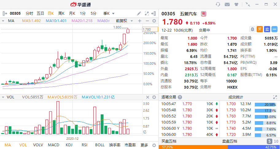 华盛资讯12月22日讯,五菱汽车(00305)早盘高开高走,涨幅一度拉升超6%,最高见1.8港元,刷新历史新高,现报1.78港元,涨幅6.59%,最新总市值54.74亿港元;该股三个月累计涨超400%。