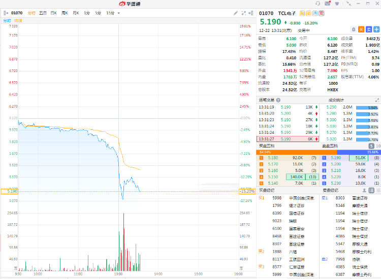 12月22日消息,TCL电子午后跳水大跌15%,现报5.19港元,市值127.2亿港元。