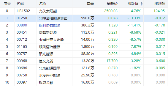 华盛资讯12月22日消息,光伏太阳能板块今日集体走跌。截止发稿,北控清洁能源大跌13.33%领跌板块,保利协鑫能源跌11.41%;协鑫新能源、卡姆丹克太阳能跌超8%,顺风清洁能源跌超7%,阳光能源、信义光能跌超3%。