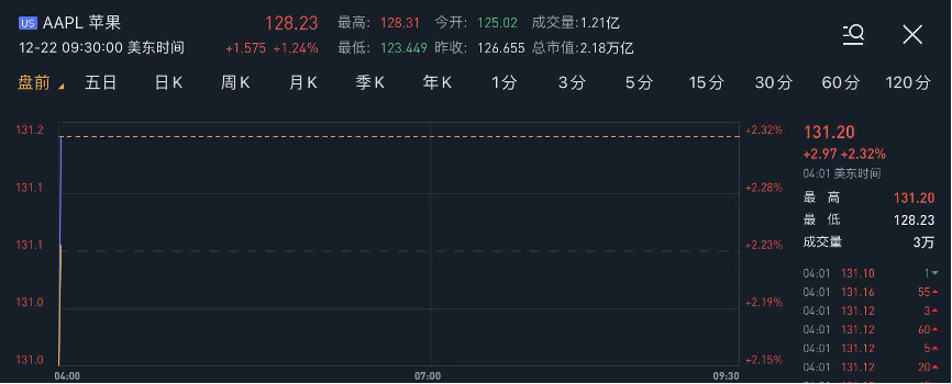 华盛资讯12月22日讯,苹果(AAPL)盘前股价大涨超2%。截至发稿涨2.32%,此前有消息人士表示苹果计划最早在2024年实现电动汽车生产。