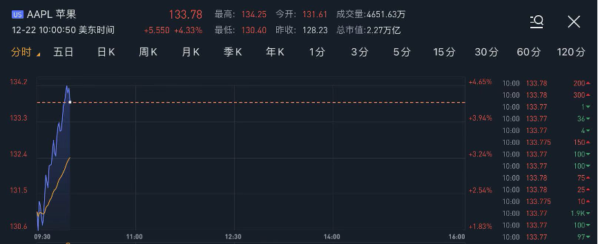 截至发稿,苹果大涨4.33%,报133.78美元,距新高仅一步之遥,当前总市值达到2.27万亿美元。