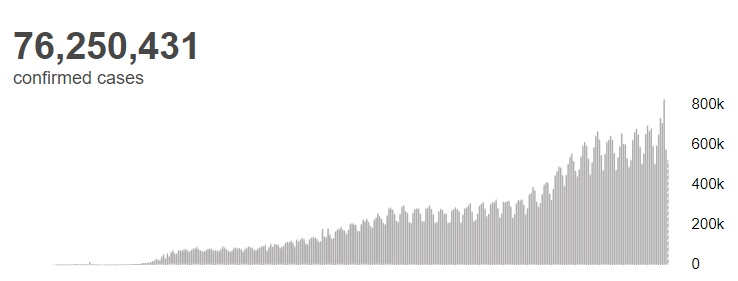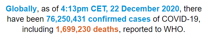 根据世卫组织最新实时统计数据,截至欧洲中部时间12月22日16时13分(北京时间12月22日23时13分),全球累计新冠肺炎确诊病例76250431例,累计死亡病例1699230例。22日全球新冠肺炎确诊病例新增524065例,死亡病例新增8775例。(总台记者 朱赫)