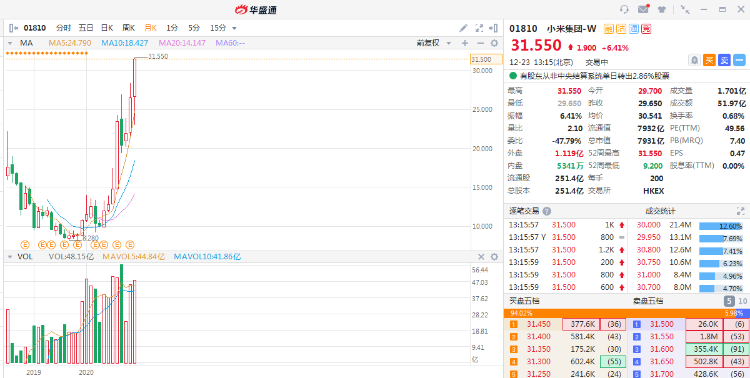 港股小米集团午后涨幅扩大超6%,报31.55港元,续刷纪录高位。市值7932亿港元。
